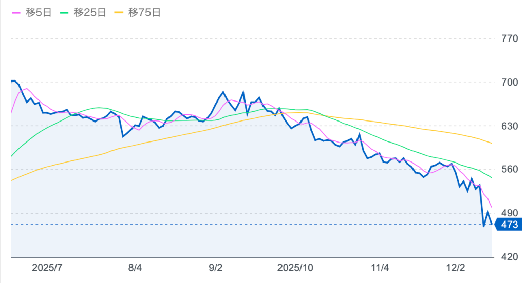 - 株価は直近で500円台から470円前後へ下落(約6%安)。