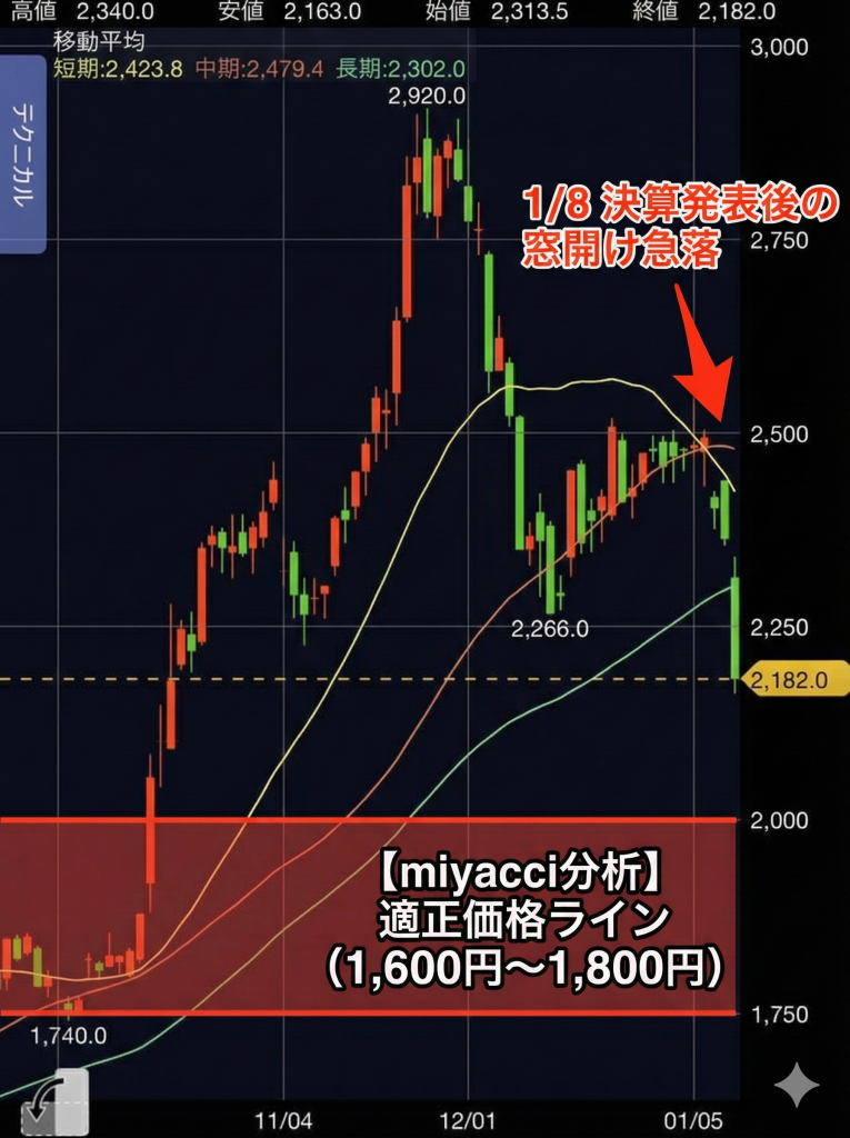 🔗 関連記事:下落前に書いた予測記事はこちら 「なぜ1,600円〜1,800円が妥当だと言えるのか?」その具体的な根拠はこちらの記事で詳しく解説しています。