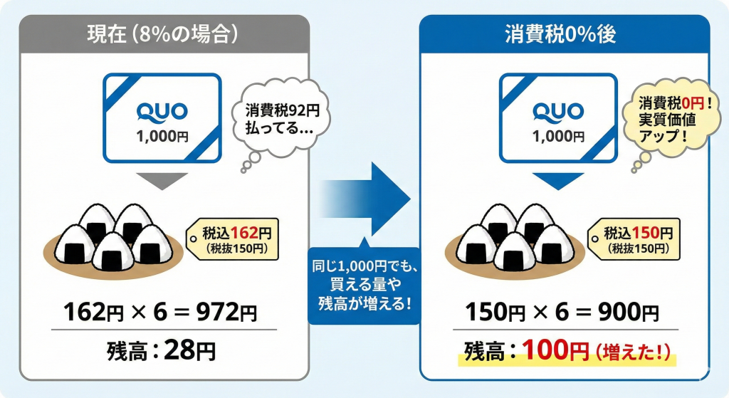 なぜなら、消費税がなくなると、「今持っている優待券の実質的な価値(=購買力)」が劇的に変わる可能性があるからです。