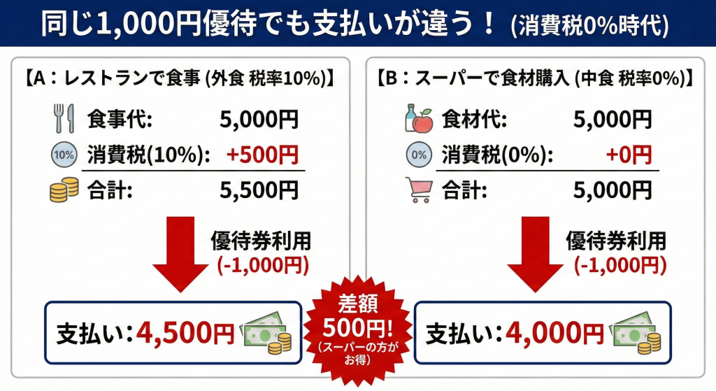 「外食の1,000円優待」と「スーパーの1,000円優待」、額面は同じですが、消費税0%時代にはその「威力」に決定的な差が生まれます。